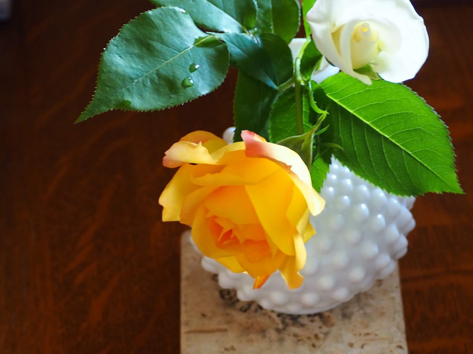 | In the vase, two roses from Mary's rose garden, the white rose is from a JFK rose that we have transplanted several times. |